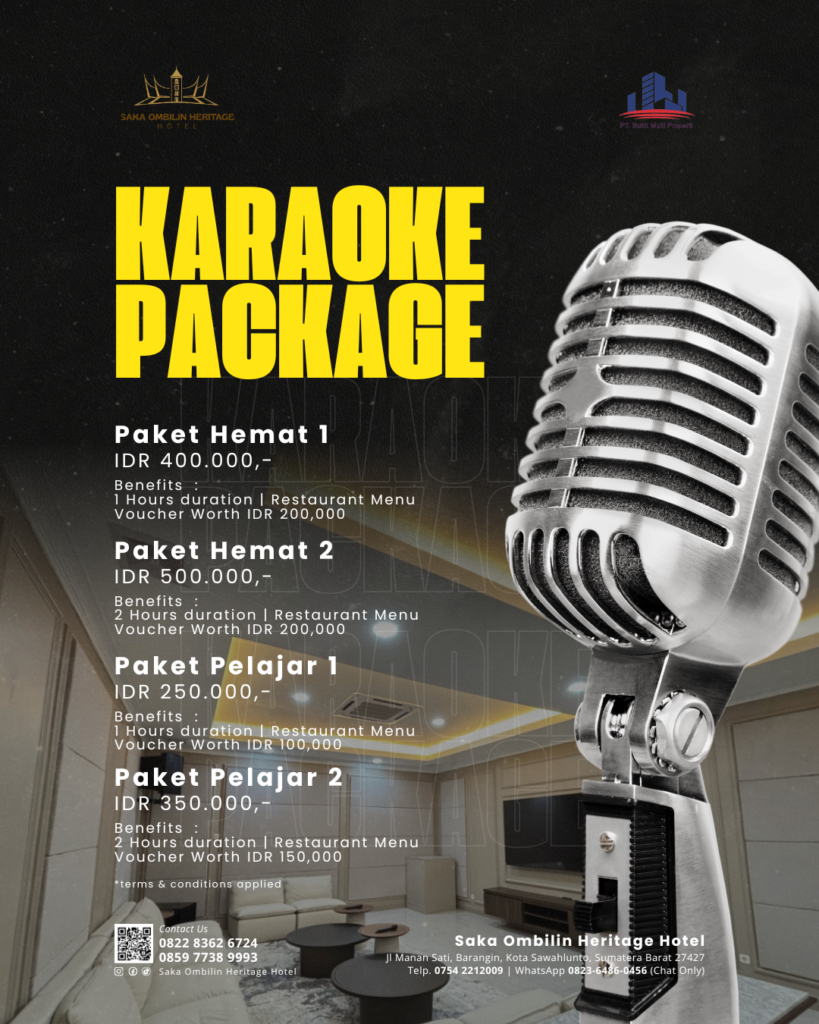 Experience a delightful evening of entertainment at Saka Ombilin Heritage Hotel. Set within our refined heritage ambiance, our karaoke room offers the perfect setting to unwind, celebrate, and create memorable moments with family, friends, or colleagues. Sing your favorite songs in a comfortable and private atmosphere, where quality sound system and attentive service come together to enhance your experience. Our karaoke facility is available for in-house guests and private gatherings.